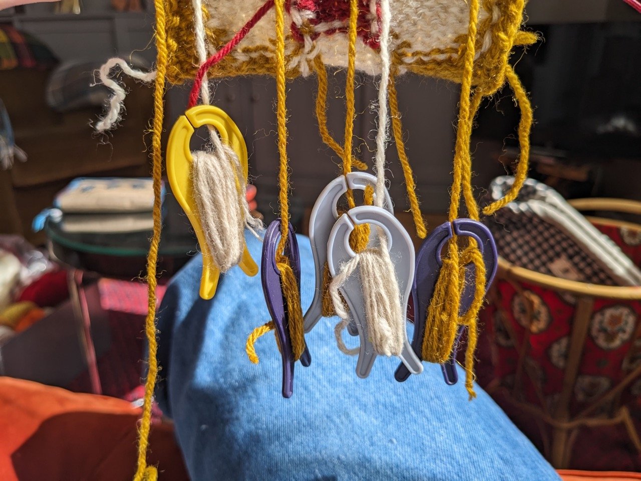 Je n’ai pas encore défait le fil provisoire de mon montage tubulaire parce que j’aime bien le contraste. Je pense que je vais tricoter les talons en rose.